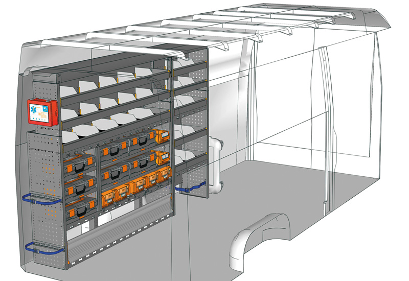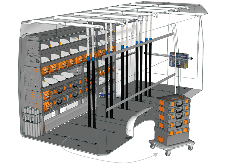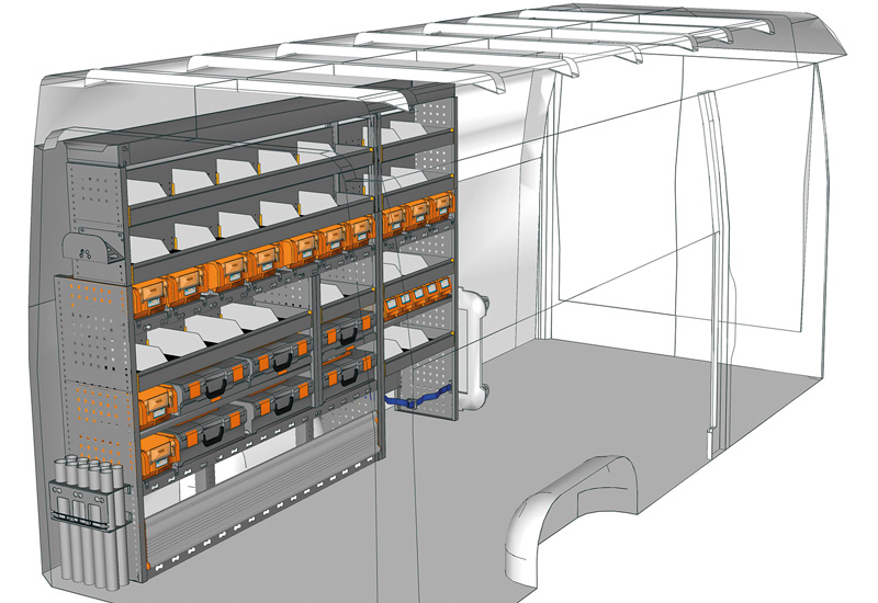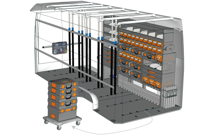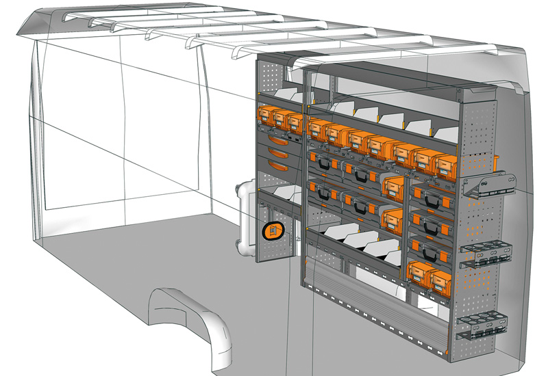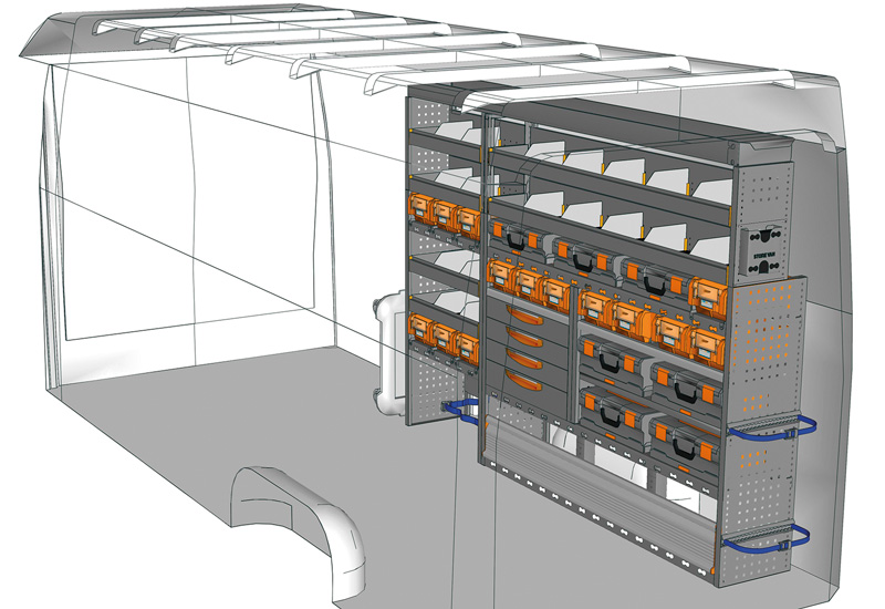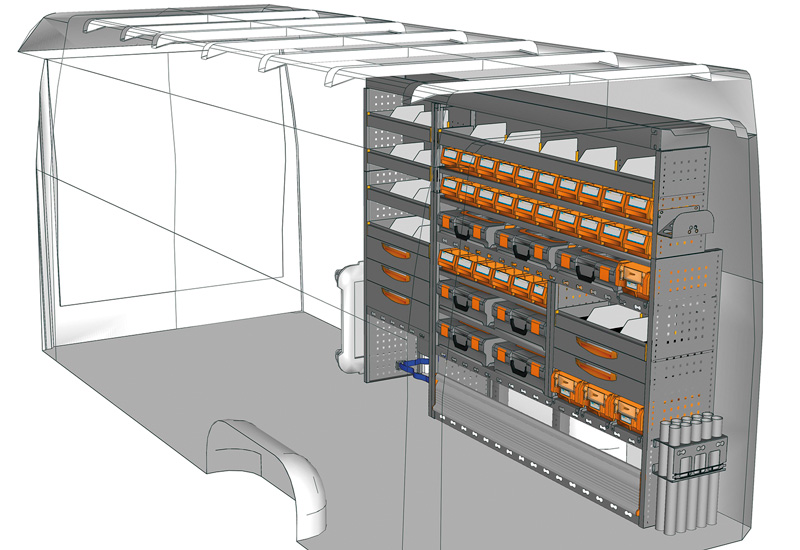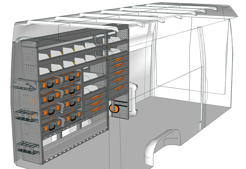 Fahrzeugeinrichtung für Profis Sprinter Hochdach/Superhochdach L3 H2/H3. Hier finden Sie Standardlösungen von Fahrzeugeinrichtungen für Mercedes-Benz Sprinter (Radstand 4325 mm).