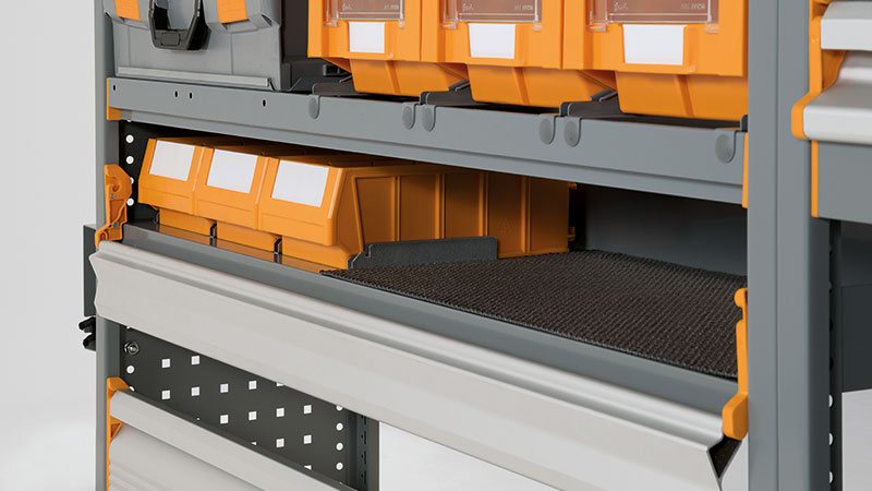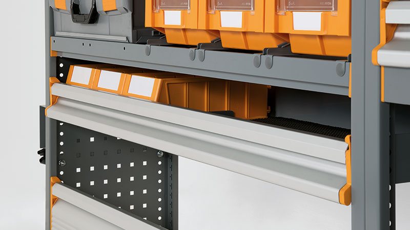 Der Inhalt ist durch die Höhe der Klapptür leicht sichtbar und kann mühelos von vorne herausgenommen werden, auch wenn der Schließflügel nach oben geklappt ist. Wenn sie mit dem Fachboden STORAGE SMART kombiniert und am oberen Bereich des mobilen Werkstattregals positioniert wird, kann sie die Langgutwanne ersetzen und sperriges Material mühelos von der langen Seite gehandhabt werden.
