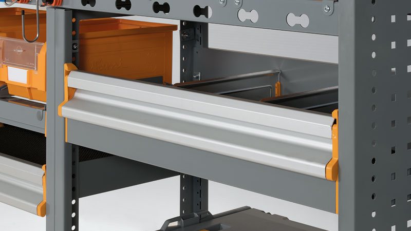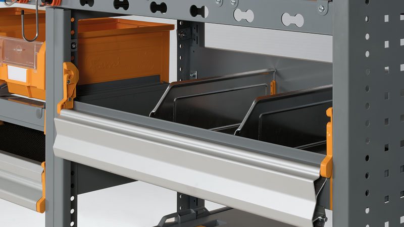 Die neue Klapptür für Regale DOOR SMALL von Store Van ist ein praktisches Schließsystem, das an den verschiedenen Komponenten einer Transportereinrichtung angebracht werden kann. Die herunterklappbare Aluminiumklapptür zum Anbringen an Fachböden, Wannen und Fächer dient zur Eindämmung der im Fahrzeug transportierten Materialien und Geräte.